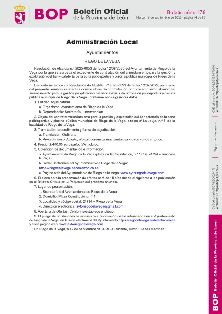 Licitación del Bar de la zona deportiva y piscinas municipalesadmin18 de septiembre de 2025Tablon de anuncios Descargar el boletín oficial Descargar el pliego de explotación del bar